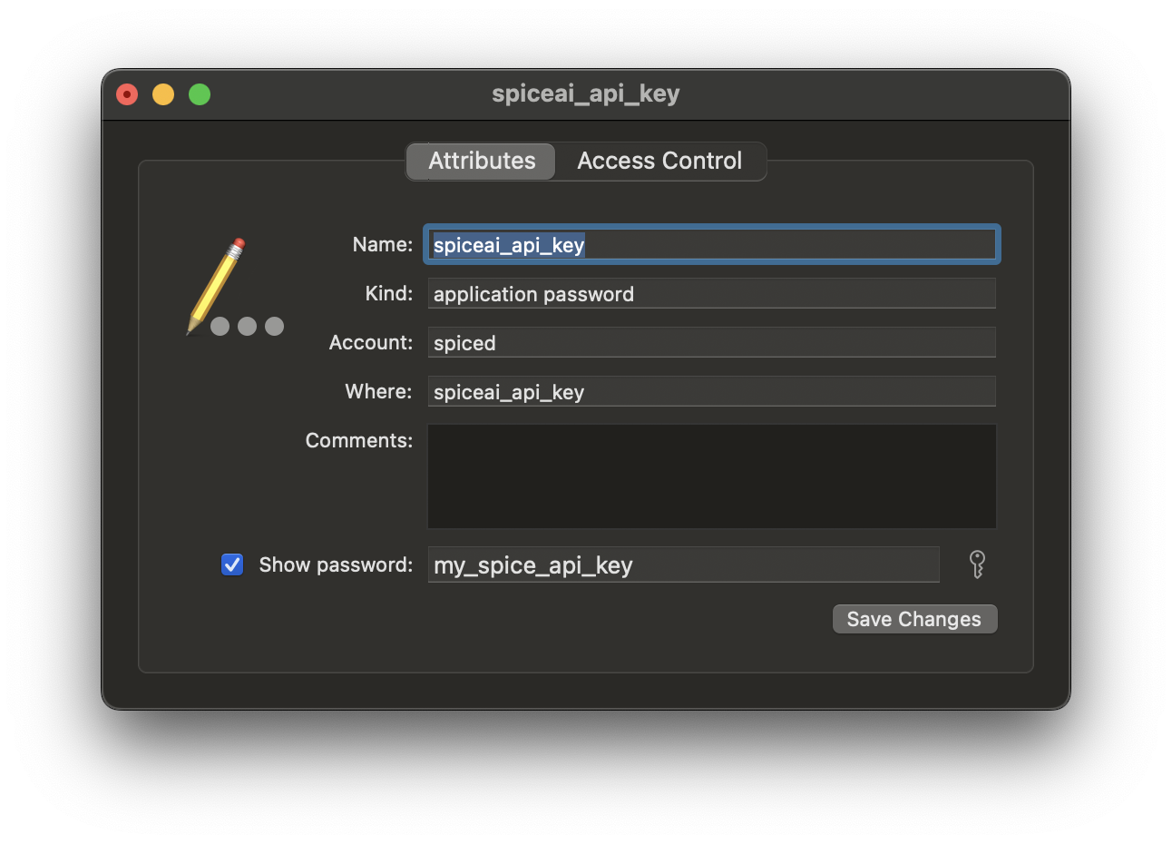 To set the spiceai API Key secret using macOS keychain, create a new keychain entry, and set the value with the API Key.