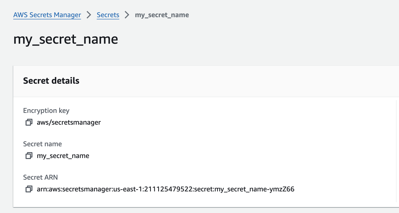 The store reads keys from the secret named in the selector. In the above example my_secret_name must be defined in AWS Secrets Manager, and any keys referenced using ${aws:my_key} will look for a key my_key within my_secret_name.